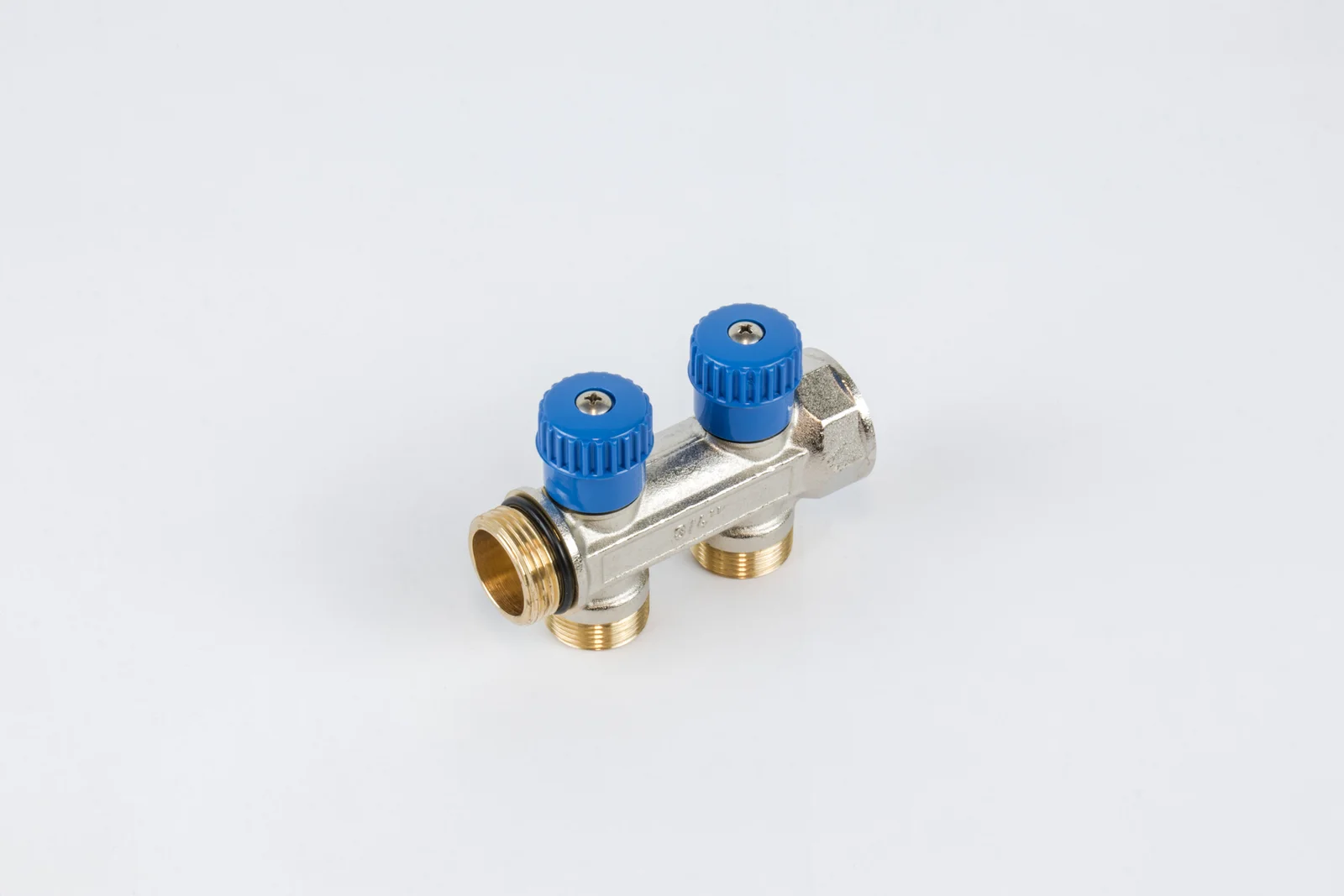 Begetube collector CV/sanitair warmgeperste kollektor 3/4 + 2 x M24 met ingeb. kranen CHROME met O-ring – BLAUW