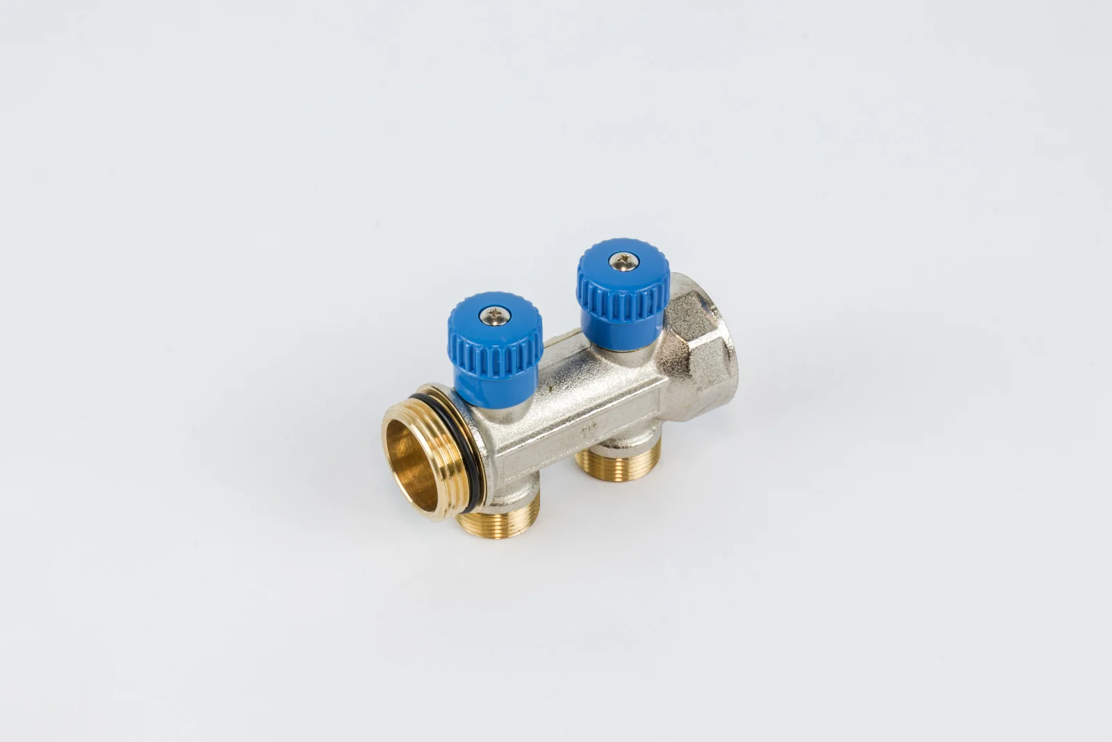 Begetube collector CV/sanitair warmgeperste kollektor 4/4 + 2 x M24 met ingeb. kranen CHROME met O-ring – BLAUW